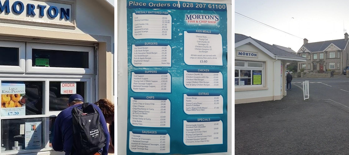 Welcome to Morton's, your go-to destination for delicious fish and chips in Ballycastle, located at the scenic seafront near the Rathlin Island Ferry Port. Our casual and trendy fast food restaurant specializes in serving mouthwatering seafood, including freshly prepared scampi, chowder, and monkfish. Perfect for lunch or dinner, we offer takeaway and delivery options, along with outdoor seating for those who want to enjoy the beautiful views. With a dedicated kids' menu and wheelchair-accessible facilities, Morton's is a family-friendly spot that welcomes groups, tourists, and university students alike. Join us for a quick bite or a leisurely meal, and indulge in the best seafood the coast has to offer!Diners rave about the incredible freshness of the fish, often highlighted as the best in town. The gluten-free options receive praise for safety and taste, making it a go-to for those with dietary restrictions. Portion sizes are generous, making every penny spent worthwhile, especially compared to prices in larger cities like London. The cleanliness of the dining area and outdoor seating is frequently noted in reviews, creating a welcoming atmosphere. Such a pleasant ambiance allows for a relaxing meal with views of the harbor, ideal after a beach day.